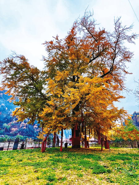 近日,佛坪县西岔河镇三教殿村的千年银杏树披上“黄金甲”,引来游客纷纷拍照、打卡。据悉,这棵银杏树年产白果达500余斤,是当地发展生态旅游的宝贵资源。(祝瑾灏 王刚 摄)