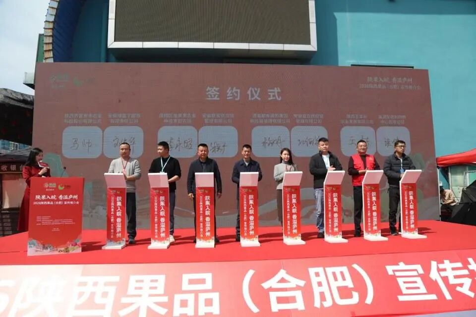 签约环节中,齐峰果业、绿资农业等 8 家陕西果品企业与安徽五星果品、百大集团等本地龙头企业现场签约,达成瑞香红、瑞雪、红富士苹果及徐香、翠香猕猴桃等果品采购意向3600吨,总价值达4260 万元。
