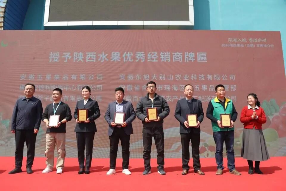 授牌仪式上,陕西省果业中心主任赵广柱为合肥周谷堆大兴农产品国际物流园颁发 “陕西果品优秀推广市场” 牌匾。陕西省果业中心授予6家当地水果经销商“陕西水果优秀经销商” 称号,表彰他们在陕西水果市场推广与销售中的突出贡献。