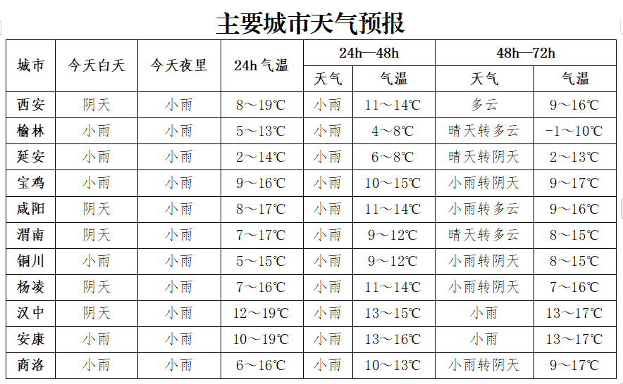 11月7日:全省阴天,陕北西部有小雨或雨夹雪(0~8毫米),陕北东部有小到中雨(3~12毫米),关中、陕南有小雨(0~10毫米),关中东部局地、陕南东部部分地方有中雨(10~15毫米),秦岭山区局地有雨夹雪。陕北有3~4级(3.4~8.0米/秒)东南风,关中大部有3~4级(3.4~8.0米/秒)偏东风,阵风6级(10.8~13.9米/秒)。陕北北部日平均气温下降4℃左右。