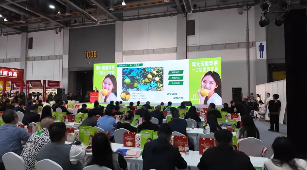 在1C-A19展位,黄中带绿、绿中透黄,果形端正、光洁如玉的瑞雪苹果整齐陈列,切开后果肉晶莹细腻,咬下时绽放复合花香,吸引了大量群众驻足品尝,众多企业家咨询洽谈。据统计,展会首日共接待采购商万人次,在订单农业、冷链物流合作等方面达成多项初步意向,为后续产销对接打下坚实基础。